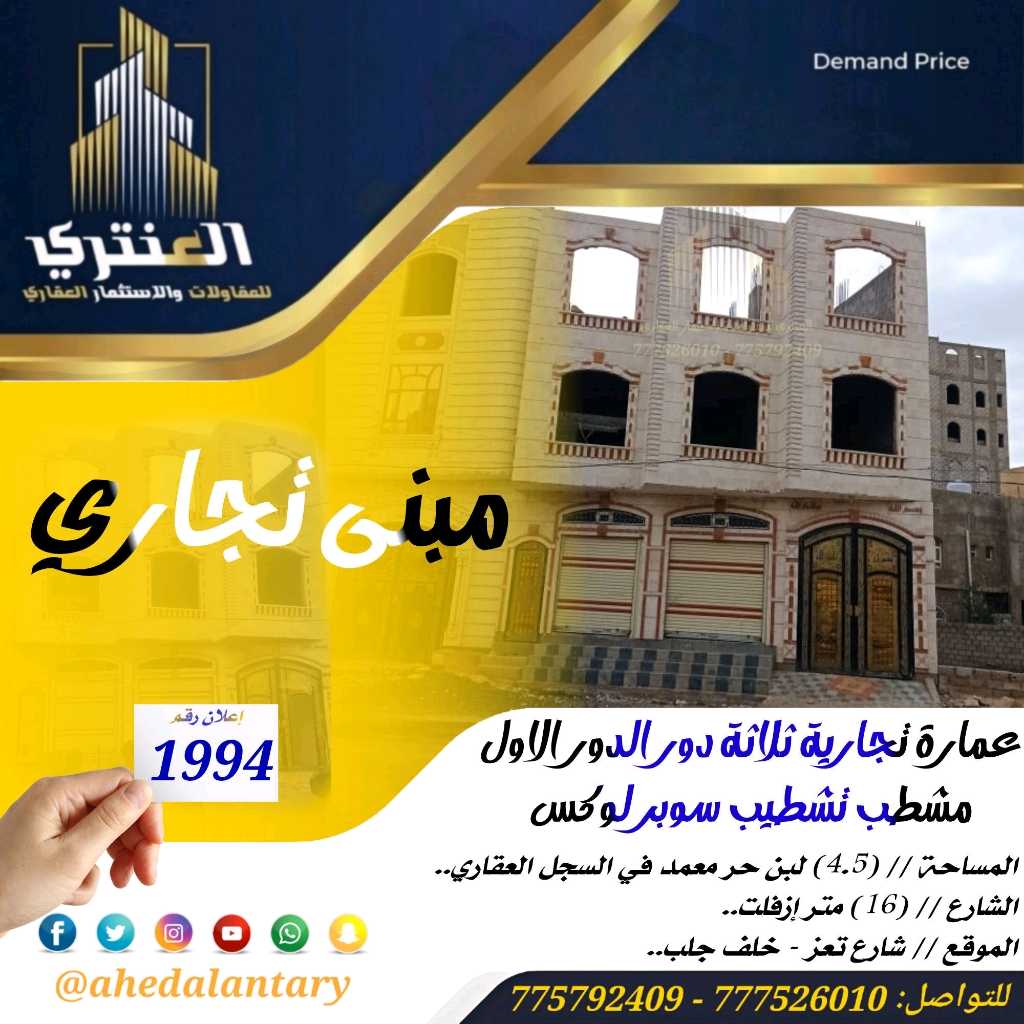 عرض رقم (1994) عمارة تجارية ثلاثة مشطب تشطيب سوبر لوكس.. المساحة // (4.5) لبن حر معمد في السجل العقاري.. الشارع // (16) متر إزفلت.. الموقع // شارع تعز - خلف جلب.. السعر // (1,200,000) مليون ومائتين الف ريال سعودي.. التفاصيل: عمارة تجارية ثلاثة دور مشطب تشطيب سوبر لوكس.. - الدور الاول يتكون من فتحتين تجارية وجراش سيارة وخزان ارضي وشقة في الخلف تتكون من غرفتين وصالة وحمام ومطبخ بمدخل عائلي ومجلس وحمام بمدخل مستقل مشطب تشطيب سوبر لوكس.. - الدور الثاني مشطب سوبر لوكس - الدور الثالث باقي له السقف فقط.. *مميزاتها* 💫 صممت الأساسات لتحمل عدد خمسة دور وملحق.. 💫 عمل كامل درجة اولى.. 💫 تأسيسات الكهرباء و السباكة درجة أولى.. 💫 الكهرباء فيها نظامين طاقة شمسية وكهرباء.. 💫 جميع المواد المستخدمة درجة أولى.. 💫 بالإضافة إلى خزان ارضي يتسع ل اربعة وايتات.. 💫 بالإضافة إلى حوش سيارة.. 💫 بالإضافة إلى واجهة حجر.. 💫 توثيق كامل ( صور + فيديو ) لجميع مراحل العمل.. *وميزات اخرى ستتعرف عليها وستشاهدها عند زيارتك لها* """"""""""""""""""""""""""""""""""""""""" #عقارات_عاهد_العنتري_للمقاولات_والاستثمار_العقاري #يمن_العقارية للتواصل: (777526010)📞 (775792409)📞 لمتابعة جميع عروضنا عبر صفحتنا على منصة الفيس بوك: https://www.facebook.com/antri.ye/ وللتواصل عبر الواتس مباشرة يرجى الضغط على الرابط التالي... https://wa.me/967775792409 للحصول على كل جديد في عالم العقارات تابعنا على قناة الواتساب.. https://whatsapp.com/channel/0029Va8yDxWGZNCzotxGlr1U رابط قناتنا على: youtube https://youtube.com/@ahedalantary 🔴 تنويه لعملائنا الكرام ومتابعينا الأعزاء يوجد لدينا مخزون هائل من العروض العقارية للفل والعمائر التجارية والمزارع والأرضي الإستثمارية العملاقة. 🔴 ملاحظة: جميع عقاراتنا من الملاك رأسا. 🔴 ملاحظة: الأسعار تتغير نتيجة لتفاوت أسعار الصرف والوضع الاقتصادي للبلد. 🌐🌐🌐🌐🌐🌐🌐🌐🌐🌐🌐🌐🌐🌐🌐🌐🌐🌐🌐