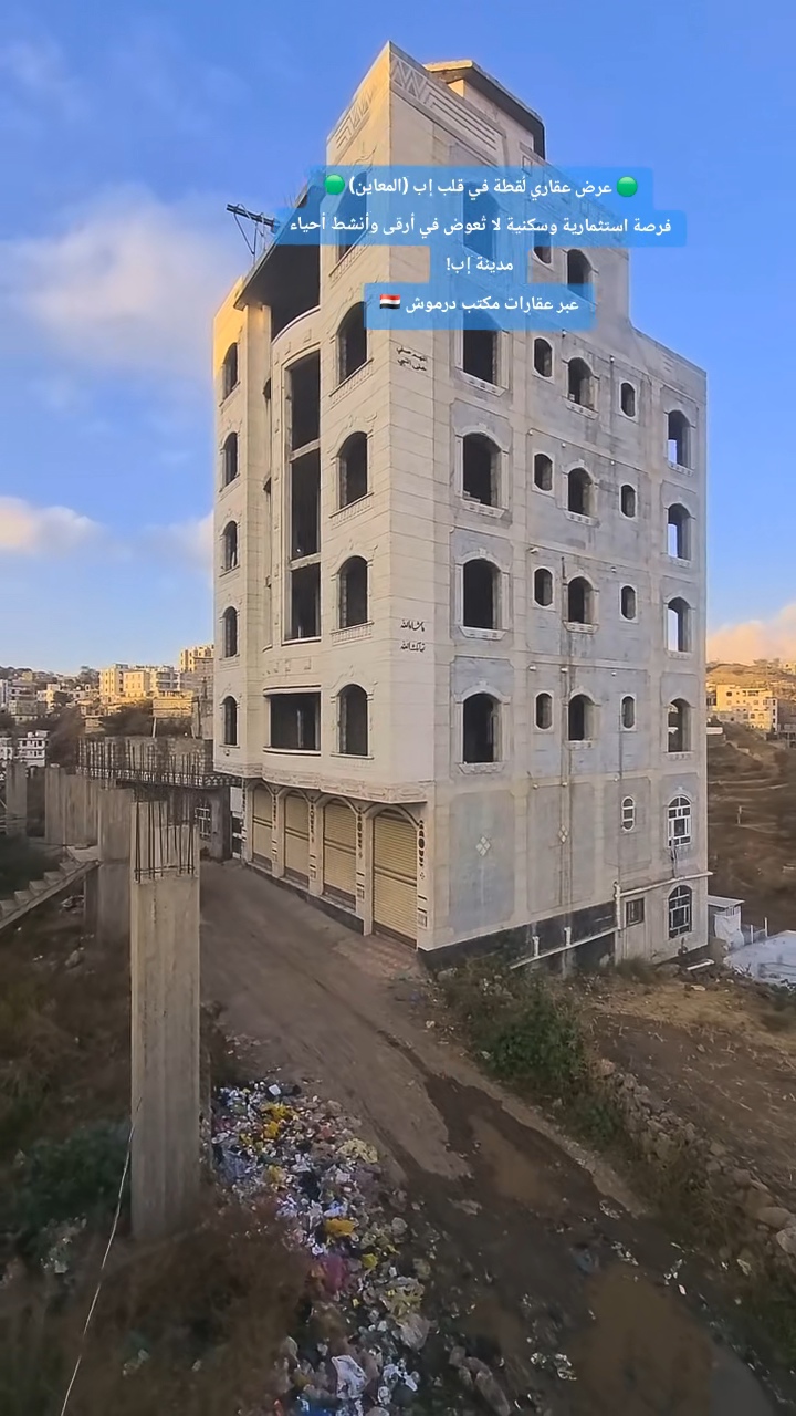 #عرض_عقاري_للبيع_في_مدينه_إب 🟢 عرض عقاري لُقطة في قلب إب (المعاين) 🟢 فرصة استثمارية وسكنية لا تُعوض في أرقى وأنشط أحياء مدينة إب! للبيع عمارة ضخمة بتصميم حديث وموقع استراتيجي في منطقة المعاين، جاهزة للسكن والاستثمار الفوري. 🏠 تفاصيل العقار: عدد الأدوار: 6 أدوار + ملحق + طيرمانة ملكية بإطلالة ساحرة. التشطيب: دورين مشطبين (لوكس) جاهزين للسكن، وبقية الأدوار عظم. المساحة: 4 قصب ونصف (حُــــــــر ومعمد). الشارع: شارع 6 متر (موقع هادئ وقريب من الخدمات). ✅ استثمار ذكي: عدد أدوار كبير يوفر لك عائداً شهرياً ممتازاً من الإيجارات. ✅ موقع حيوي: حي المعاين يتميز بتوفر كافة الخدمات (مدارس، أسواق، مستشفيات). ✅ حرية التصرف: الأرض حُر، مما يضمن لك سهولة الإجراءات القانونية. ✅ جاهزية السكن: اسكن في الأدوار المشطبة وشطب البقية براحتك. 📍 #إب_الخضراء