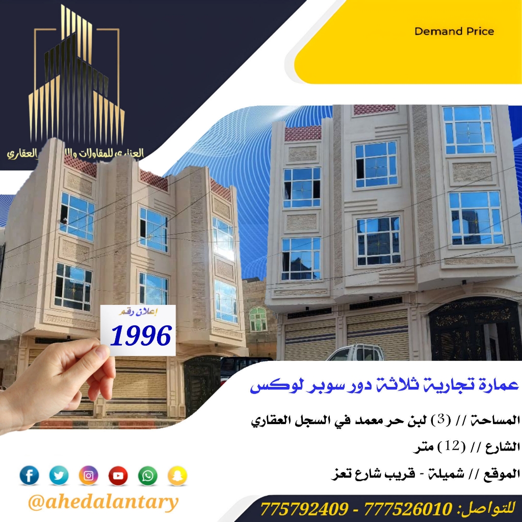 عرض رقم (1996) عمارة تجارية ثلاثة دور مشطبة سوبر لوكس.. المساحة // (3) لبن حر معمد في السجل العقاري.. الشارع // (12) متر.. الموقع // شميلة - قريب شارع تعز.. السعر // (280,000 $) مائتين وثمانين الف دولار قابل للتفاوض.. التفاصيل: - الدور الاول يتكون من فتحتين تجارية وجراش سيارة وخزان ارضي وشقة في الخلف.. - الدور الثاني يتكون من شقة كبيره نظام فله.. - الدور الثالث نفس تصميم الدور الثاني.. 💫 صممت الأساسات لتحمل عدد خمسة دور وملحق وطيرمانة.. 💫 قريبة جدا من الشارع العام والاسوق.. 💫 الاوراق معمدة وموثقة في السجل العقاري.. 💫 عمل كامل درجة اولى.. 💫 الموقع ارقئ واجمل الاحياء الراقي والجميلة في امانة العاصمة.. 💫 تأسيسات الكهرباء و السباكة درجة أولى.. 💫 بالإضافة إلى خزان ارضي.. 💫 بالإضافة إلى جراش سيارة.. 💫 بالإضافة إلى واجهة حجر.. 💫 وجميع الاعمال موثقه من بداية الأعمال الإنشائية حتى آخر اللمسات.. https://youtube.com/shorts/IDbTI3WAWNs?si=BFAKLCXtTxtlL86W *وميزات اخرى ستتعرف عليها وستشاهدها عند زيارتك لها* """"""""""""""""""""""""""""""""""""""""" #عقارات_عاهد_العنتري_للمقاولات_والاستثمار_العقاري #يمن_العقارية للتواصل: (777526010)📞 (775792409)📞 تابعونا عبر منصاتنا الرسمية لمشاهدة كل جديد: 🔹 واتساب: https://wa.me/967775792409 🔹 فيسبوك: facebook.com/antri.ye 🔹 فيسبوك: facebook.com/yemenalaqarya 🔹 يوتيوب: youtube.com/@YemenAlaqarya 🔹 تيليجرام: https://t.me/YemenAlaqarya 🔹 إنستغرام: instagram.com/yemenalaqarya 🔹 تويتر: twitter.com/YemenAlaqarya 🔹 تيك توك: @ahedalantary 🔹 قناة الواتساب: https://whatsapp.com/channel/0029Va8yDxWGZNCzotxGlr1U 📲 لا تفوّتوا العروض الحصرية والتحديثات أولًا بأول! 🔴 تنويه لعملائنا الكرام ومتابعينا الأعزاء يوجد لدينا مخزون هائل من العروض العقارية للفل والعمائر التجارية والمزارع والأرضي الإستثمارية العملاقة. 🔴 ملاحظة: جميع عقاراتنا من الملاك رأسا. 🌐🌐🌐🌐🌐🌐🌐🌐🌐🌐🌐🌐🌐🌐🌐🌐🌐🌐🌐