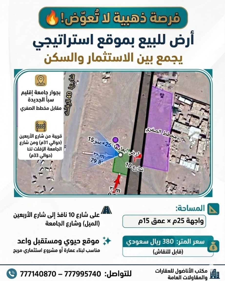 فرصة ذهبية لا تُعوّض! 🔥 أرض للبيع بموقع استراتيجي يجمع بين الاستثمار والسكن 📍 بجوار جامعة إقليم سبأ الجديدة – مقابل مخطط الصفري 🚧 قريبة من شارع الأربعين (حوالي 31م) ومن شارع الجامعة الزفلت (حوالي 33م) 📐 المساحة: واجهة 25م × عمق 15م 🛣 على شارع 10م نافذ إلى شارع الأربعين (الميل) وشارع الجامعة 💰 سعر المتر: 380 ريال سعودي ✨ موقع حيوي ومستقبل واعد – مناسب لبناء عمارة أو مشروع استثماري مربح 📞 للتواصل: 773851338 🏢 مكتب الأناضول للعقارات والمقاولات العامة موقع "25×عمق 15شارع 10" هو geo:15.4951307,45.2997476 https://geo.ldks.net/15.4951307,45.2997476,20(25%C3%97%D8%B9%D9%85%D9%82+15%D8%B4%D8%A7%D8%B1%D8%B9+10)